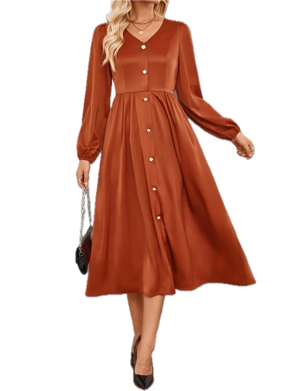 Women's V Neck Balloon Sleeve Midi Dress Ninety% Polyester Ten% Spandex Stretchy Fit for Daytime and Evening Looks
