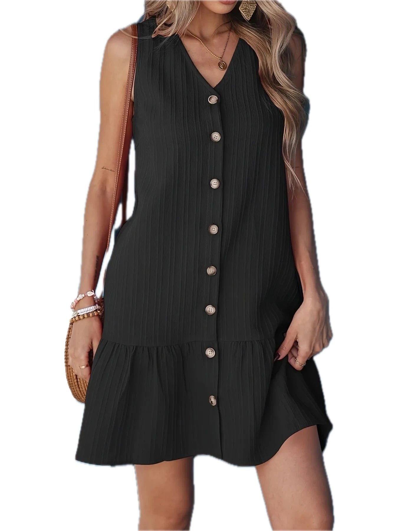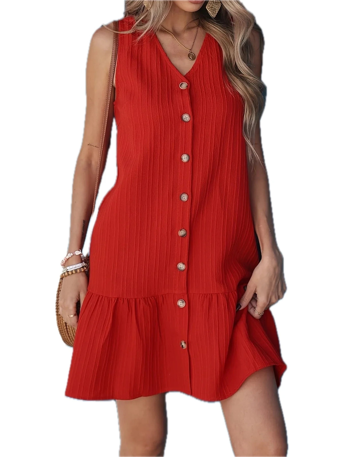 Women's V-Neck Button-Front Ruffle Hem Dress in Lightweight 100% Polyester Fabric for Everyday Wear Silhouette
