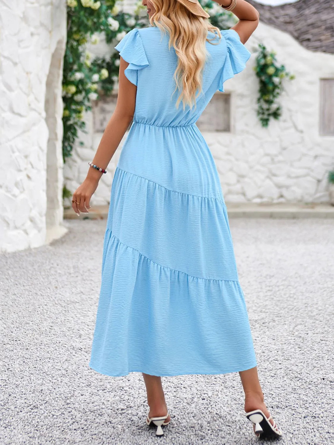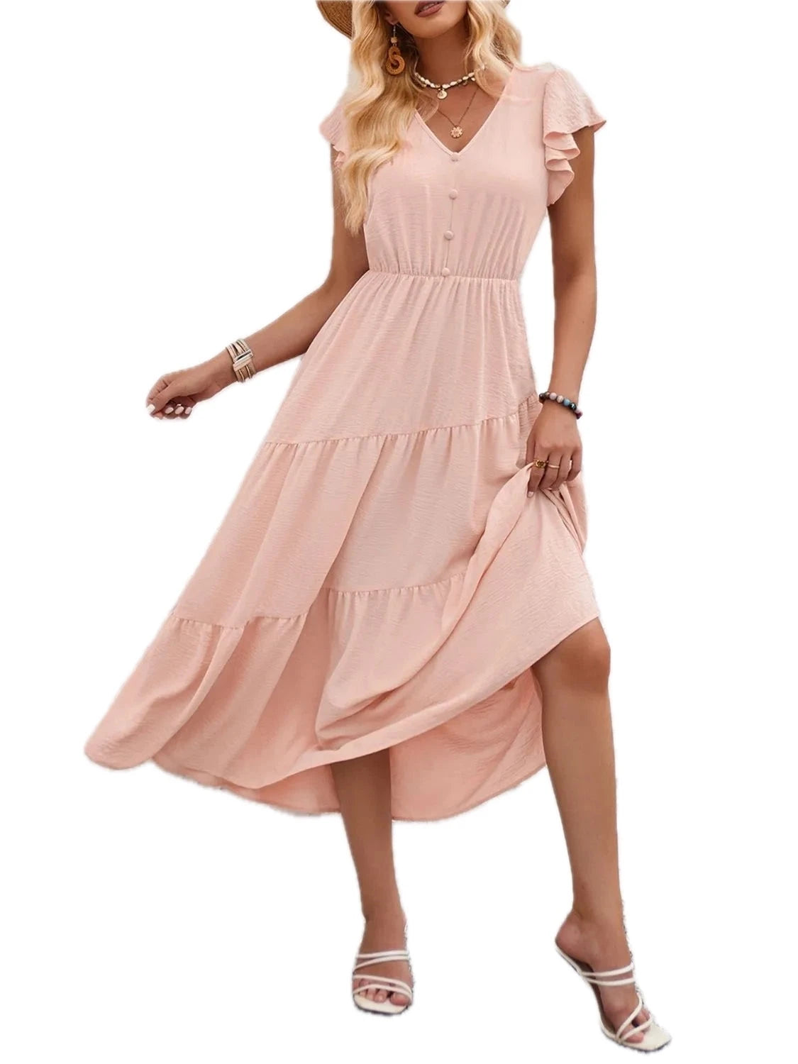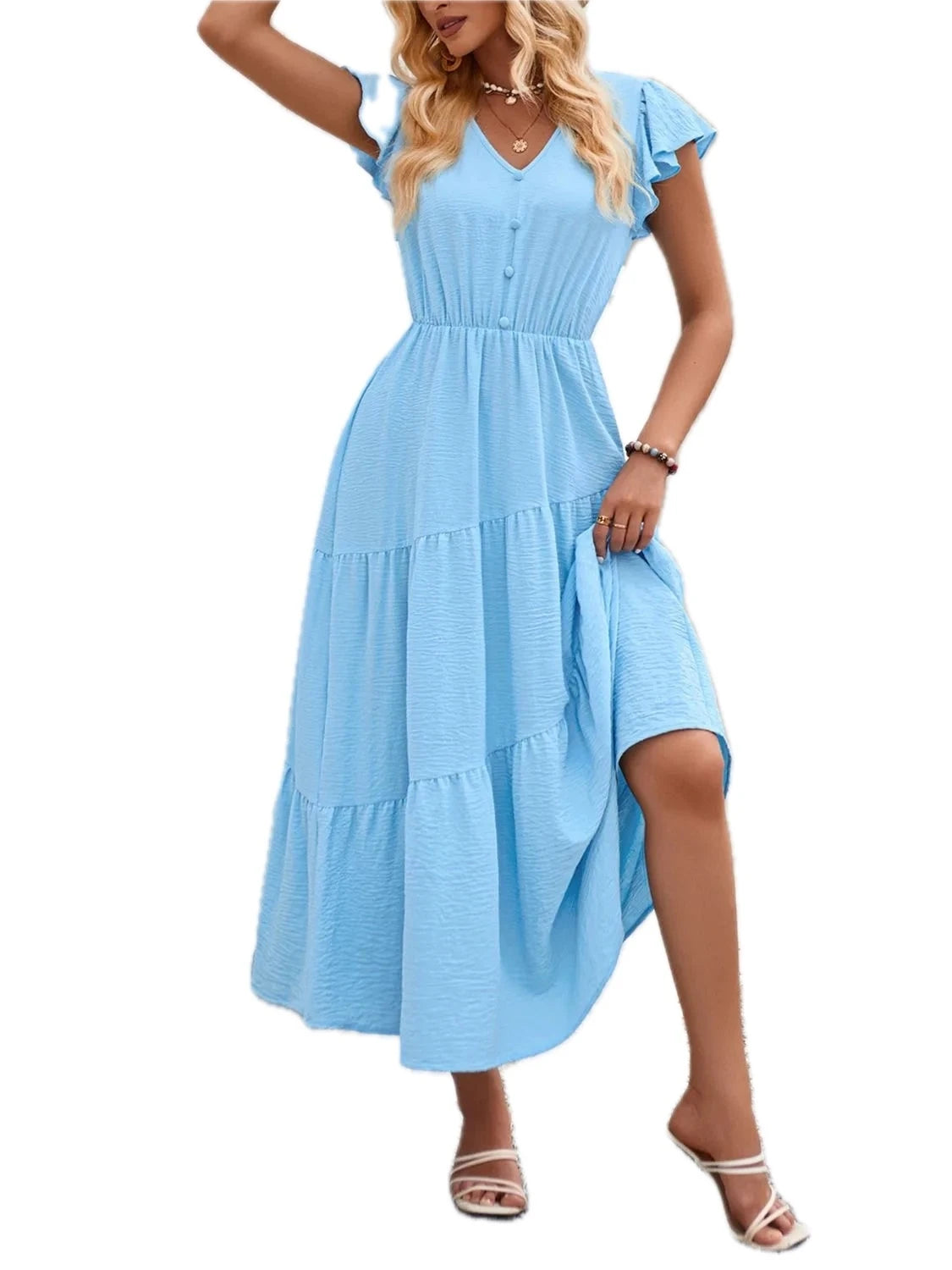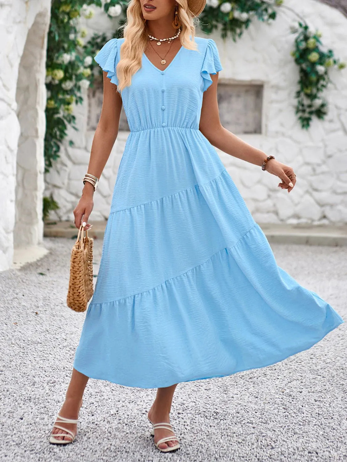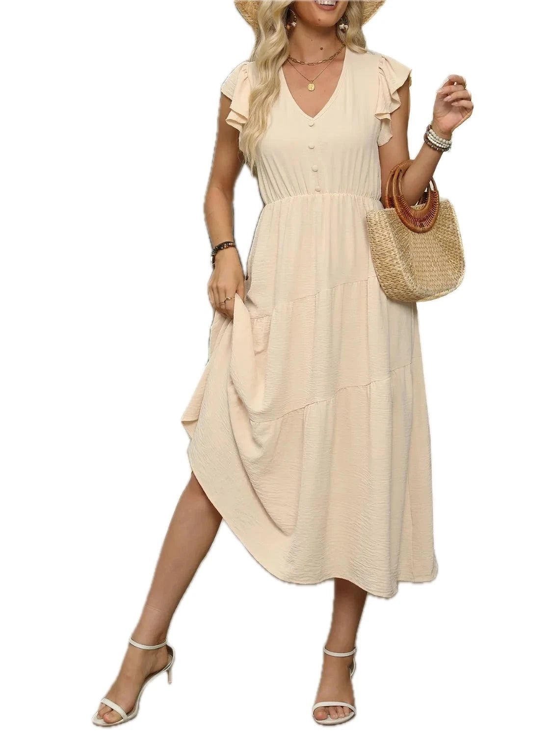 Women's V Neck Ruffle Sleeve Dress with Ruched Details and Decorative Button Accent 100% Polyester for day wear