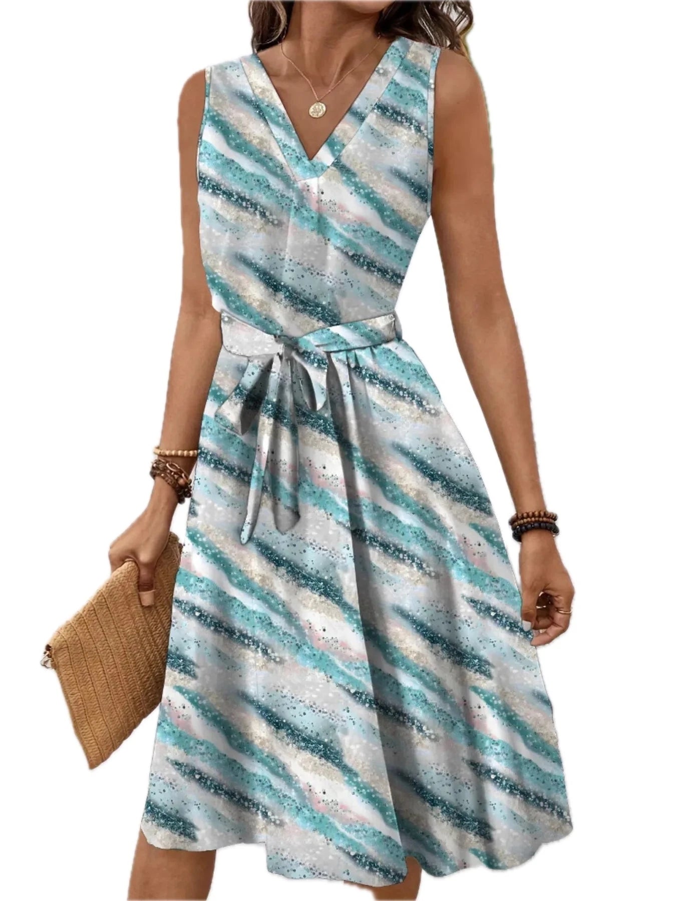 Women's V Neck Sleeveless Tie Waist Dress with Belted Silhouette Perfect for Casual Office Wear fabric 100% polyester