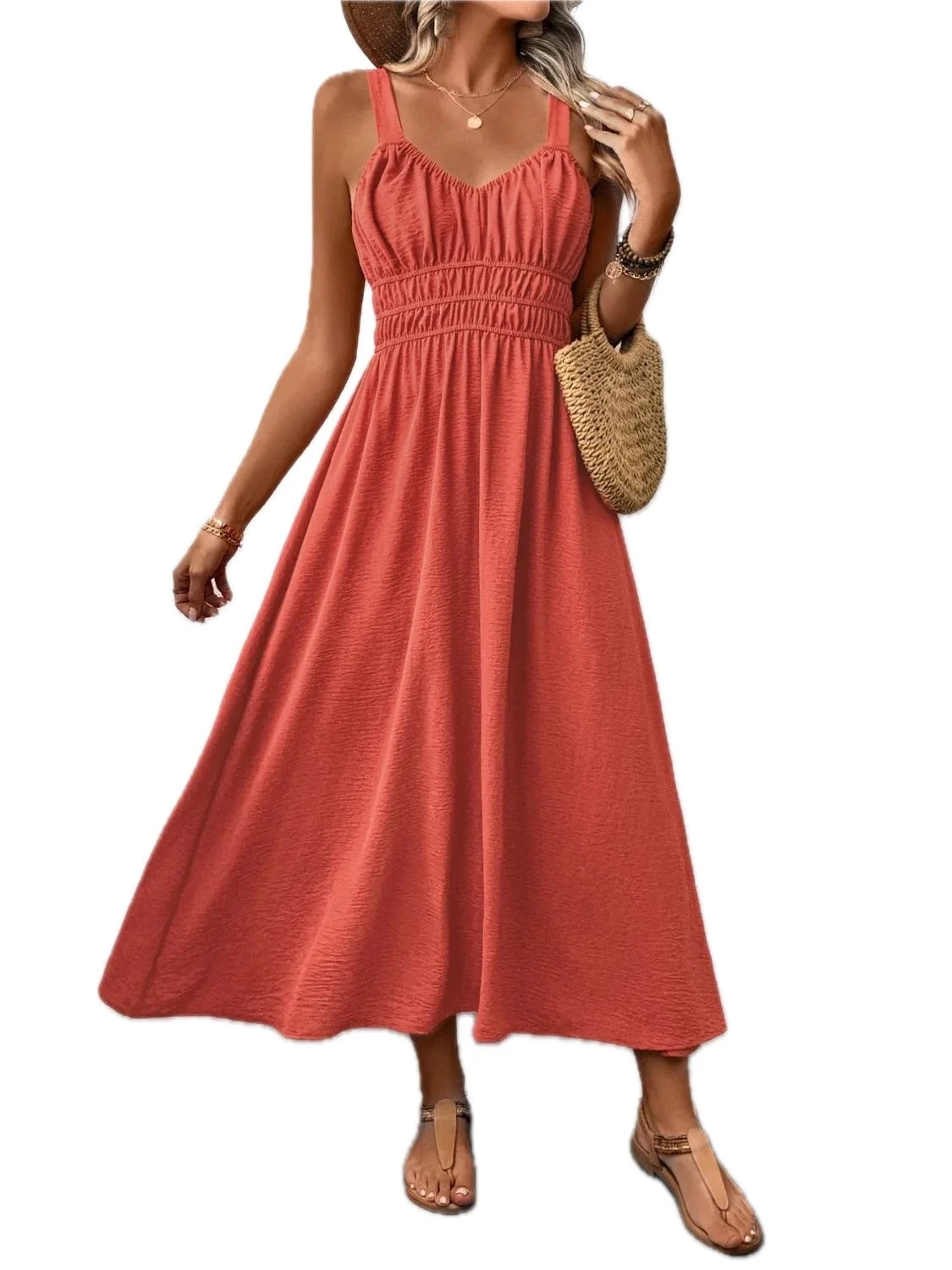 Women's V Neck Wide Strap Midi Cami Dress with Tied Ruched Look 100% Polyester Lightweight Easy Care Everyday Wear
