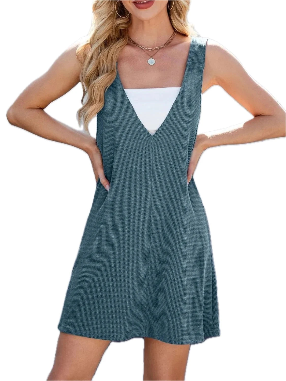 Women's V-Neck Wide Strap Overalls Dress with Slightly Stretchy Fit Imported 65% Rayon 30% Polyester 5% Spandex