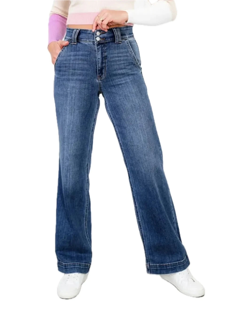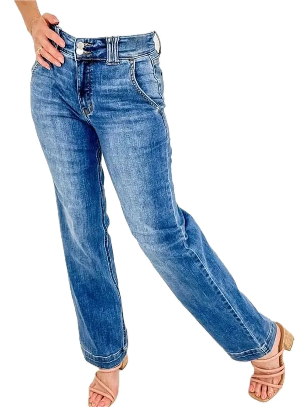 Womens Washed Straight Leg Jeans With Buttoned Pockets Slightly Stretchy Durable Denim For Everyday Casual Comfort Wear