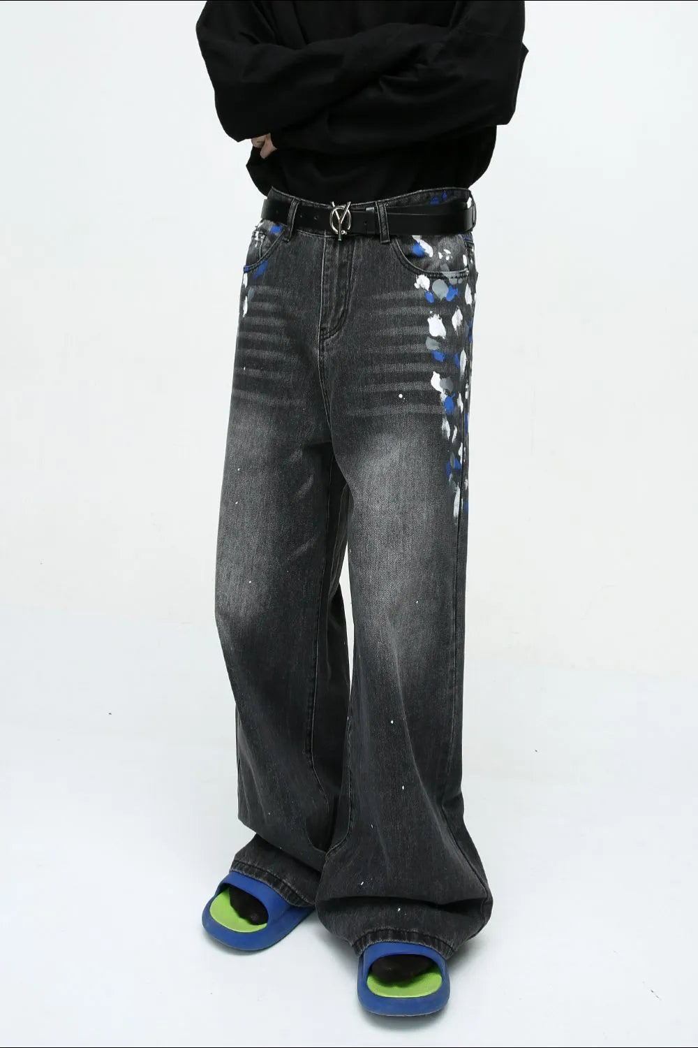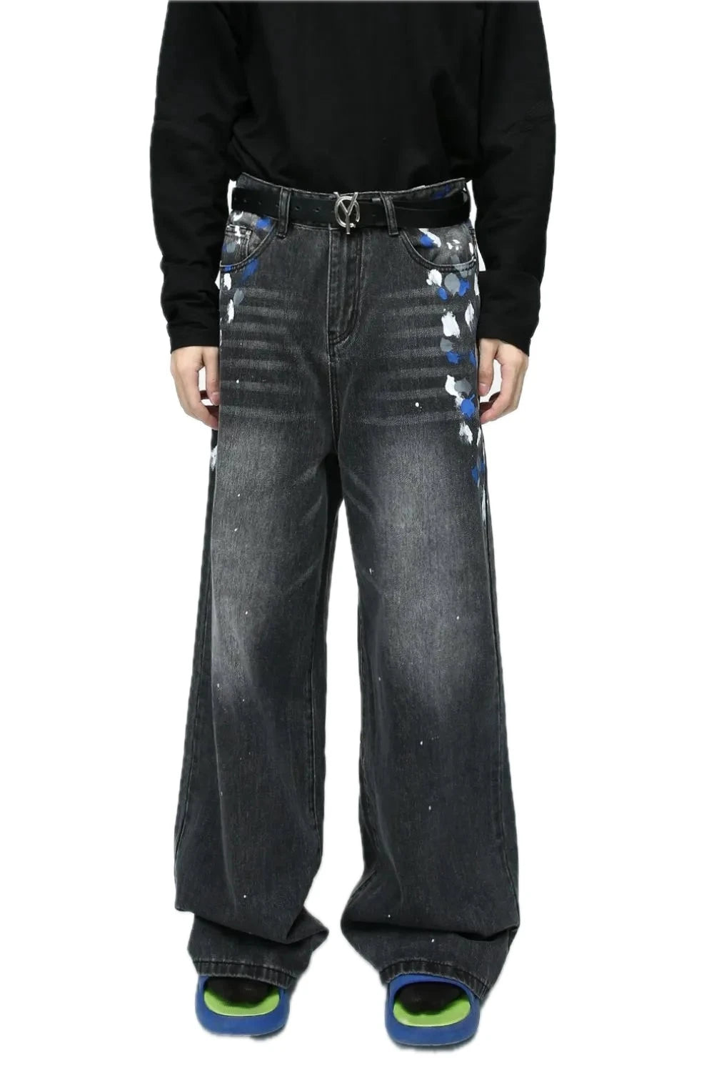 Women Watercolor Print Wide Leg Jeans with Pockets No Stretch Durable High Quality Casual Everyday Denim Pants