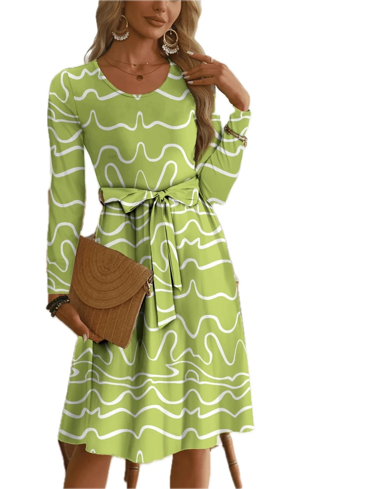 Women's Wave Print Long Sleeve Tie Waist Dress 100% Polyester Lightweight Everyday Wear Comfortable Fit for all day wear