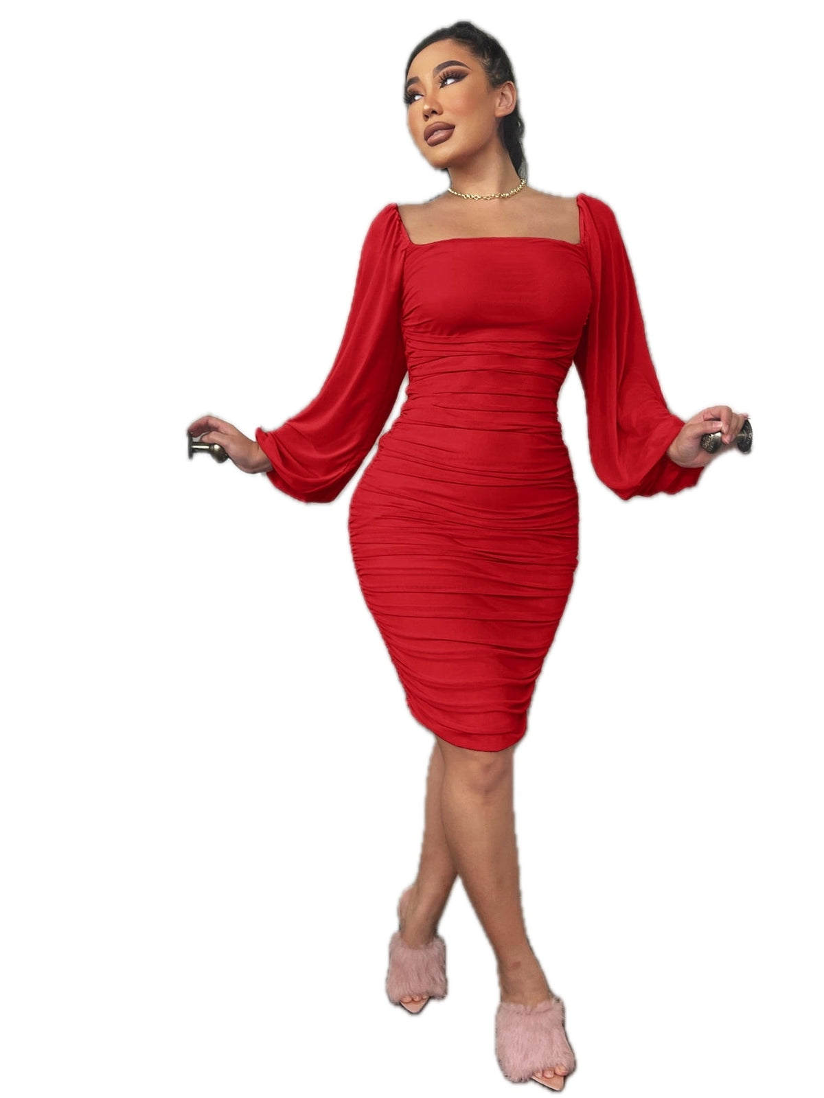 Women's Zip Back Ruched Bodycon Dress Square Neck Knee Length Long Sleeve Chic Minimalist 60% Elastane 40% Polyester