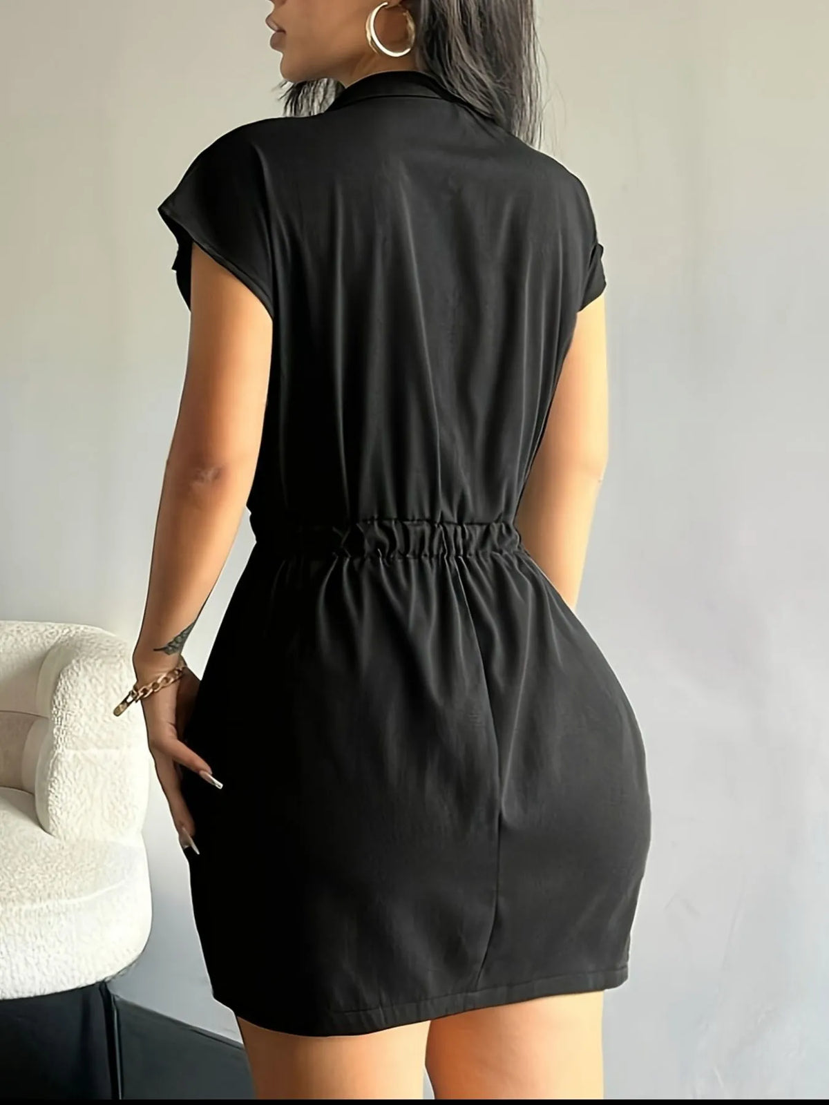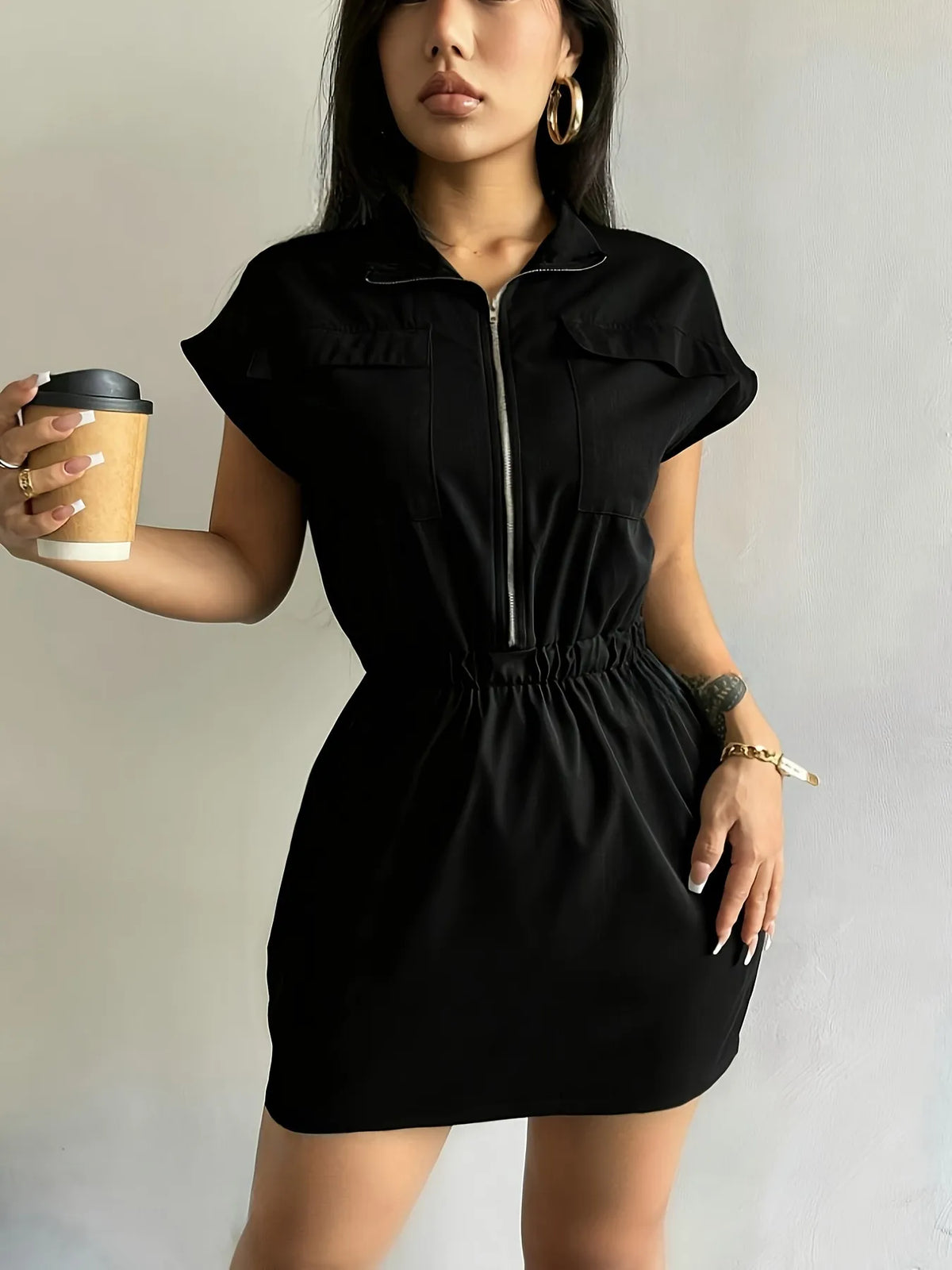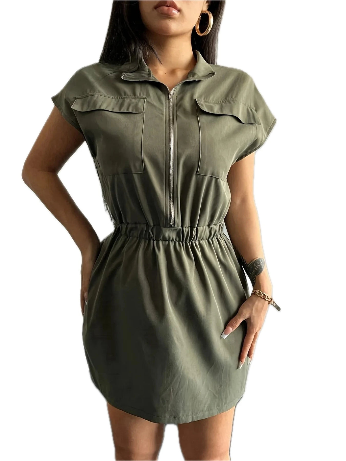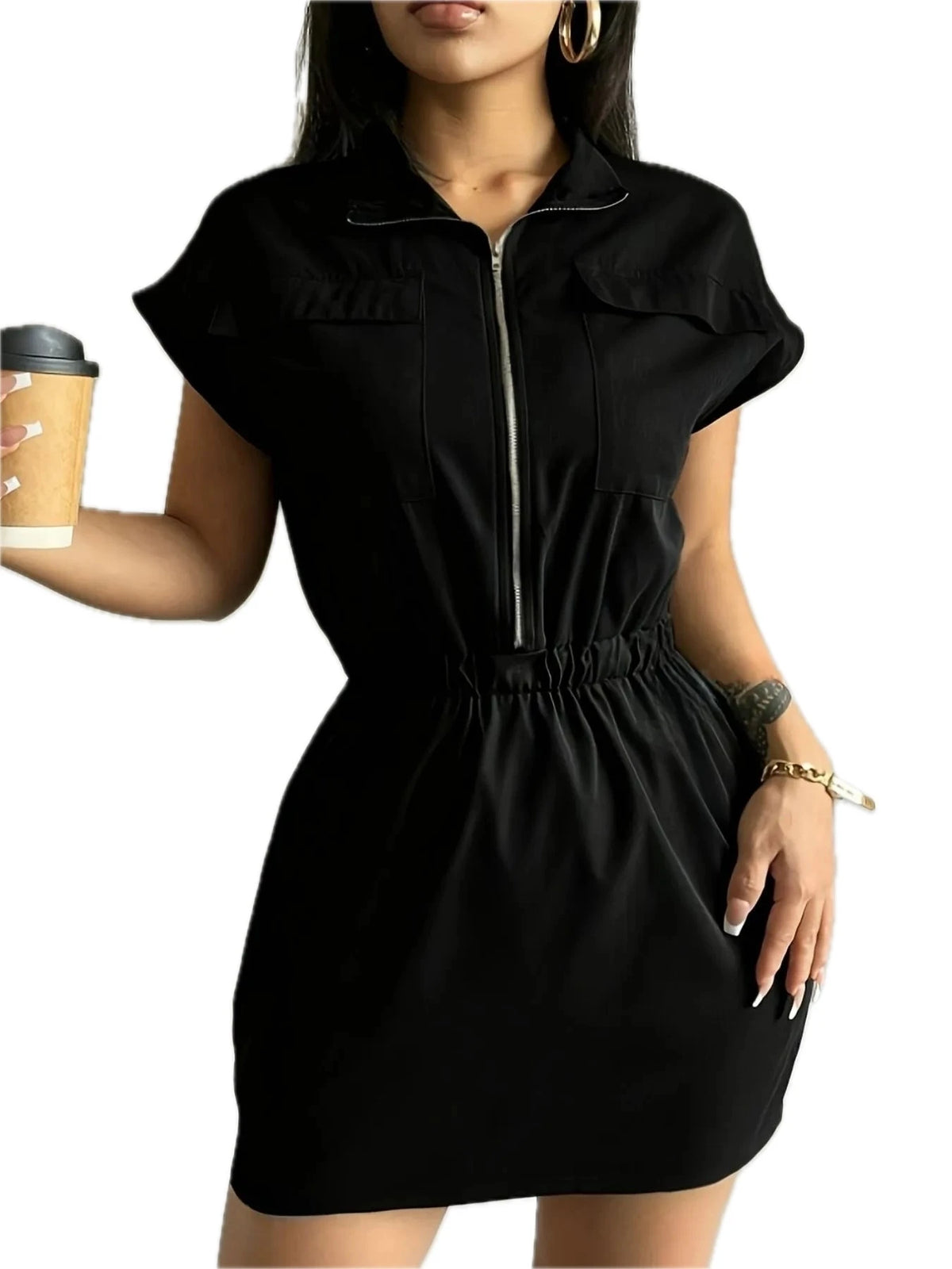 Women's Zipper Front Short Sleeve Mini Dress with Pockets in Polyester % Fabric for Everyday Wear Great everyday wear